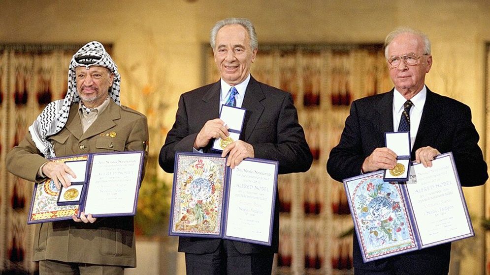 ১৯৯৪ সালে শান্তিতে নোবেল পুরস্কার যৌথভাবে পান ইসরাইলের প্রধানমন্ত্রী আইজ্যাক রবিন, পররাষ্ট্রমন্ত্রী শিমন পেরেস এবং ফিলিস্তিনি মুক্তি সংস্থার (পিএলও) চেয়ারম্যান ইয়াসির আরাফাত।